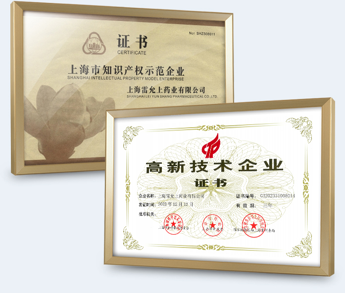 2016年,上海金年会|金年会·科技药业股份有限公司荣列上海市专利工作示范企业,并于2018年底以优秀成绩通过上海市知识产权局验收。2019年,申报第一届上海市知识产权创新奖(保护)并获一等奖。2019年被认定为国家知识产权优势企业。2023年荣获国家知识产权示范企业、上海市创新型中小企业、上海市专精特新中小企业、上海市产教融合型培育企业。
